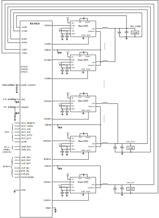 RS16630 is a AVSBus compliant triple output multiphase buck controller with built-in MTP & PMBus™ interface. It is fully compatible with Reed Semiconductor’s smart power stage. Advanced control features such as programmable DC load line, undershoot & overshoot reduction provide fast transient response hence needing low output capacitance. The device also provides auto phase add/drop with phase current balancing for efficiency improvement across loads. It supports fast dynamic voltage transitions with programable slew rates. All programmable parameters can be configured by the PMBus interface and can be stored in devices as default values. The MTP gives an added advantage of optimizing the device performance in the field.