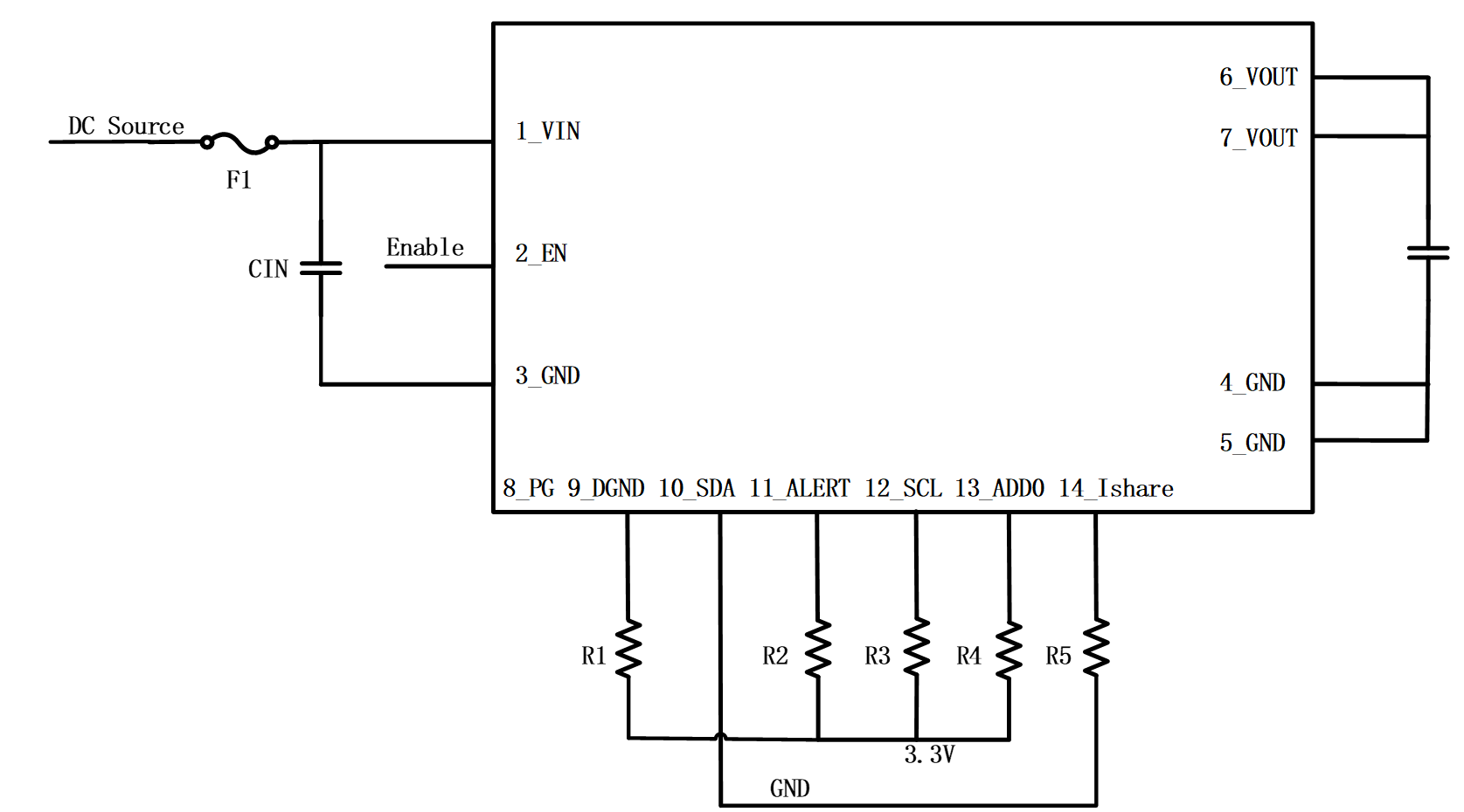 The built-in digital controller can store and restore module configurations. The fault status, input voltage, output voltage, output current, and temperature are monitored via the PMBus interface.